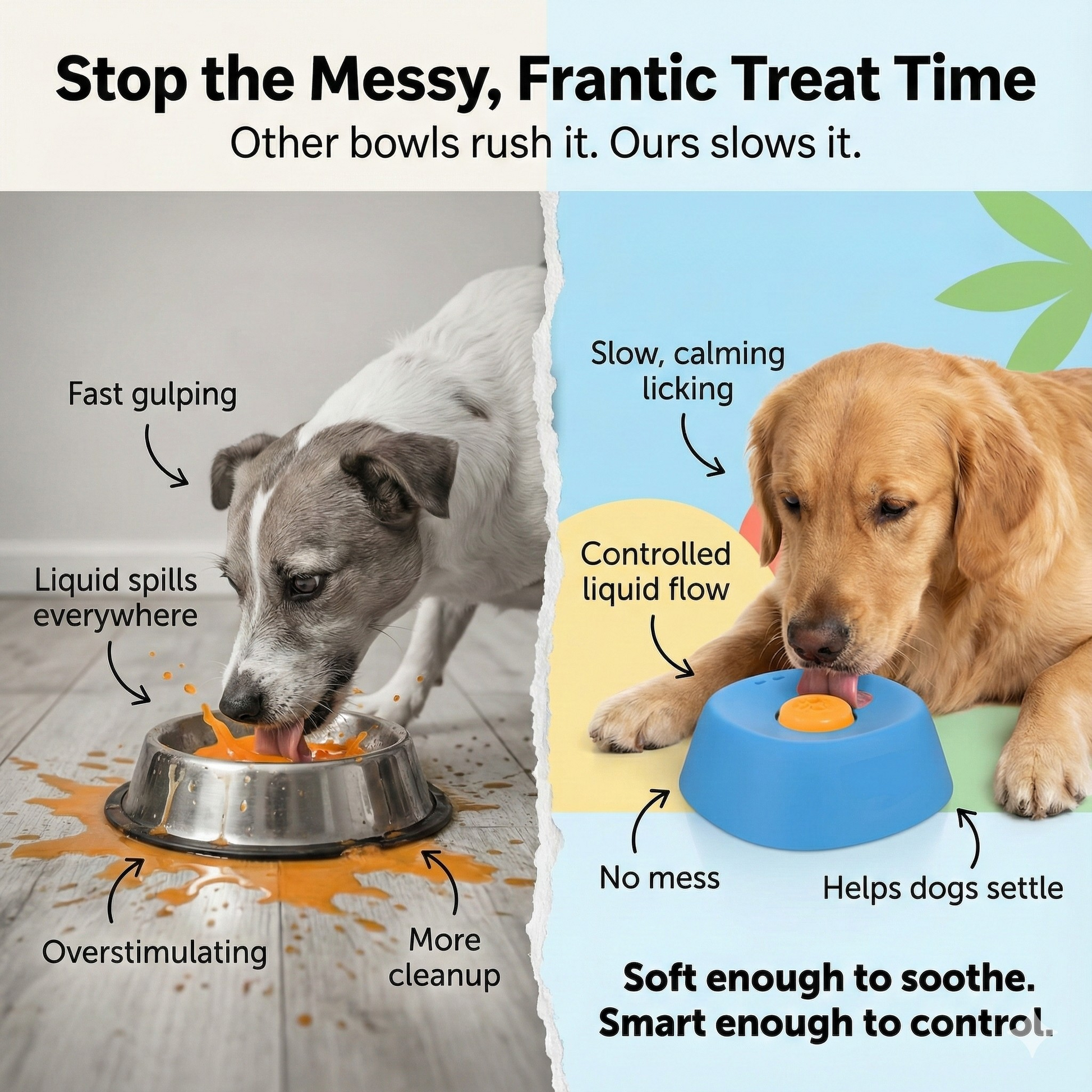 Our floating ball mechanism regulates the flow of water or liquid treats, turning every lick into a soothing, controlled experience. By slowing your dog's pace, it reduces mess, prevents fast gulping, and encourages calm enrichment-perfect for puppies, seniors, and dogs with sensitive stomachs
